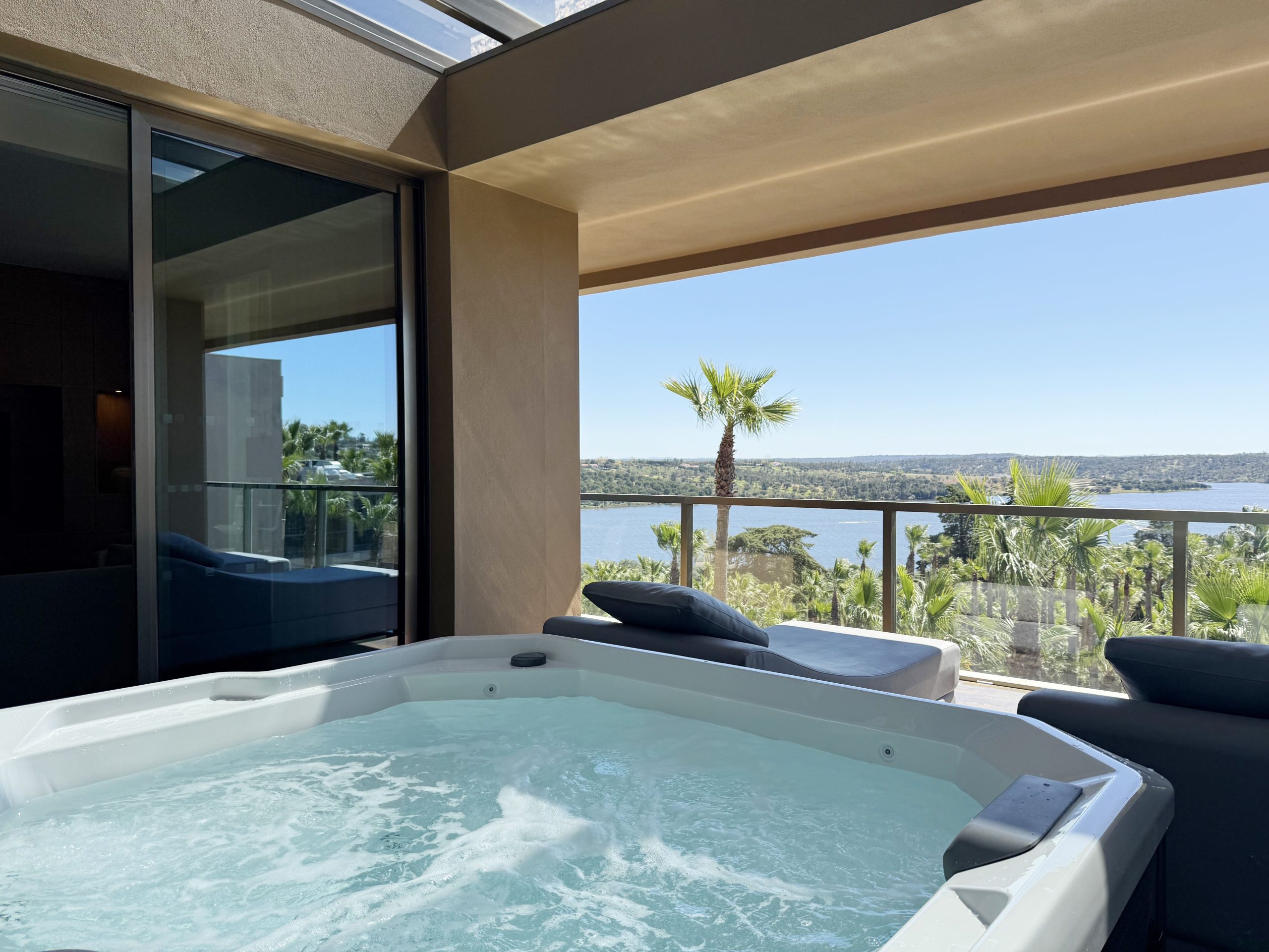 In the Penthouse Suite you can also enjoy the following amenities: accommodates up to 2 adults, 85 m², bedroom with double bed, large private balcony with stunning lake views, jacuzzi on the balcony, minibar, climate-controlled wine cellar – wines included – by Quinta de São Sebastião, air conditioning, telephone, hairdryer, safe, Smart TV (living room and bedroom), Nespresso coffee machine, free Wi-Fi access, and 2 bathrooms.