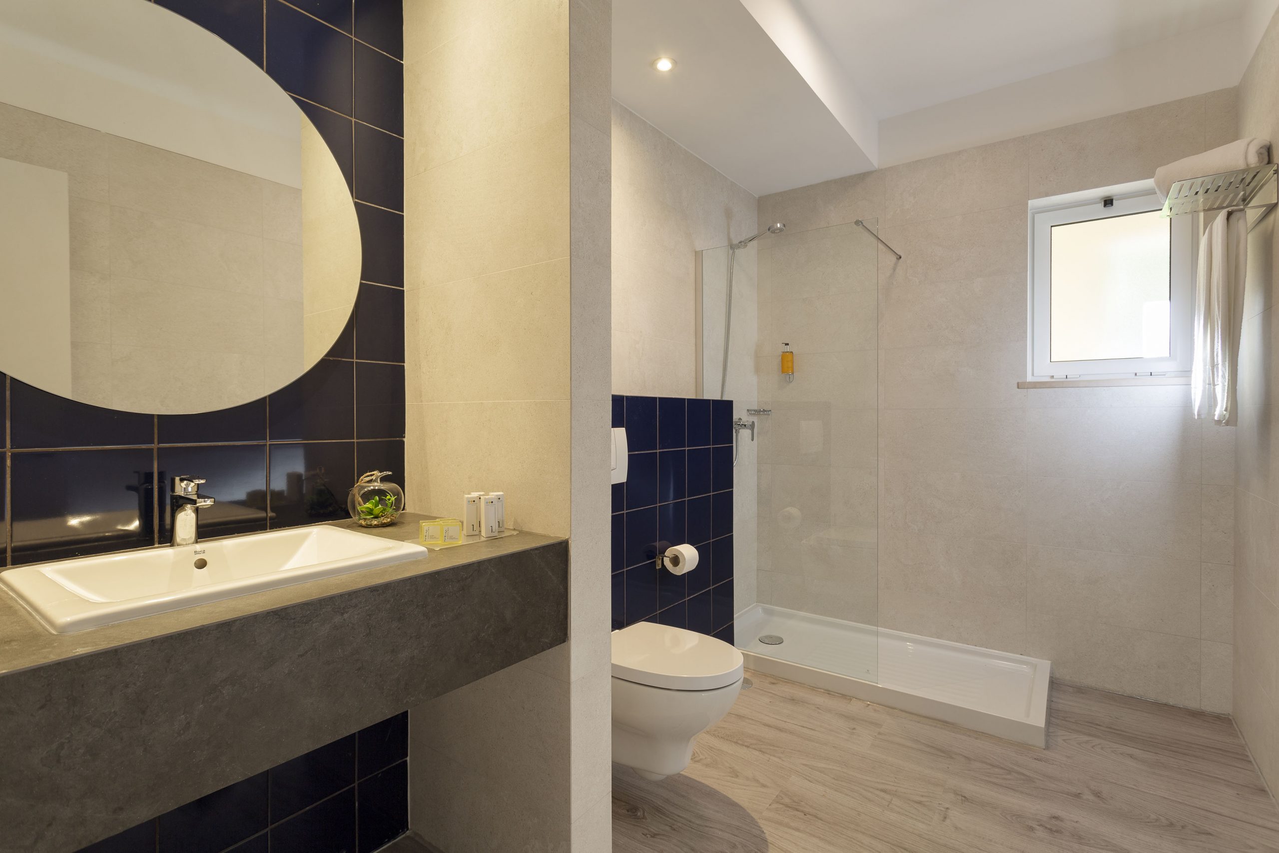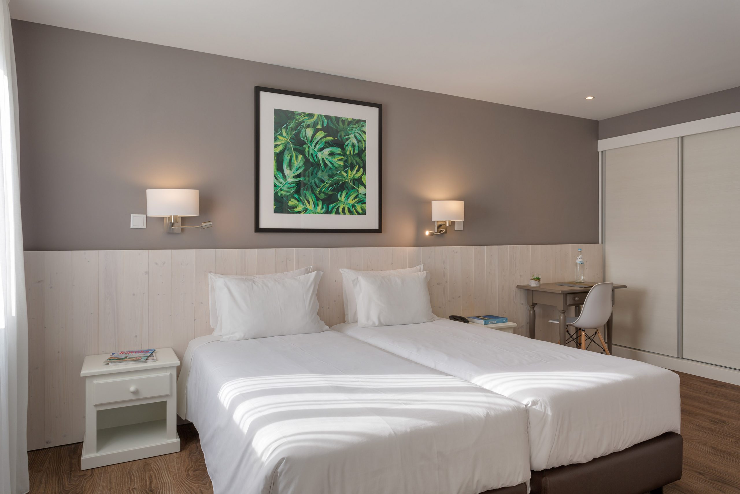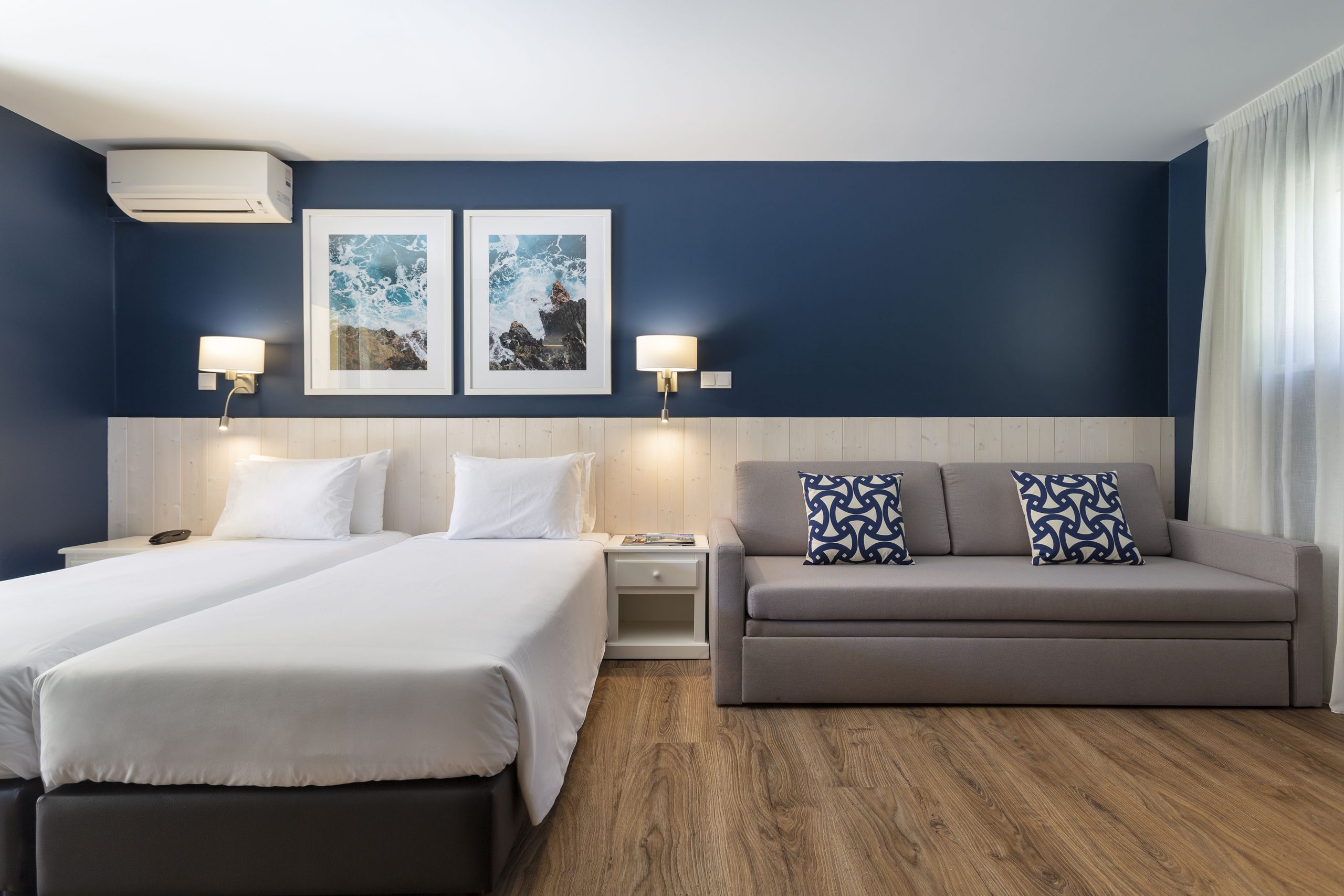 Os quartos Twin Large têm 21 m2, capacidade até 3 pessoas e incluem televisão lcd, ar-condicionado, mini frigorífico, telefone, Wi-Fi, Casa de banho privativa com, Secador de cabelo, Produtos de higiene pessoal gratuitos, Varanda ou terraço.