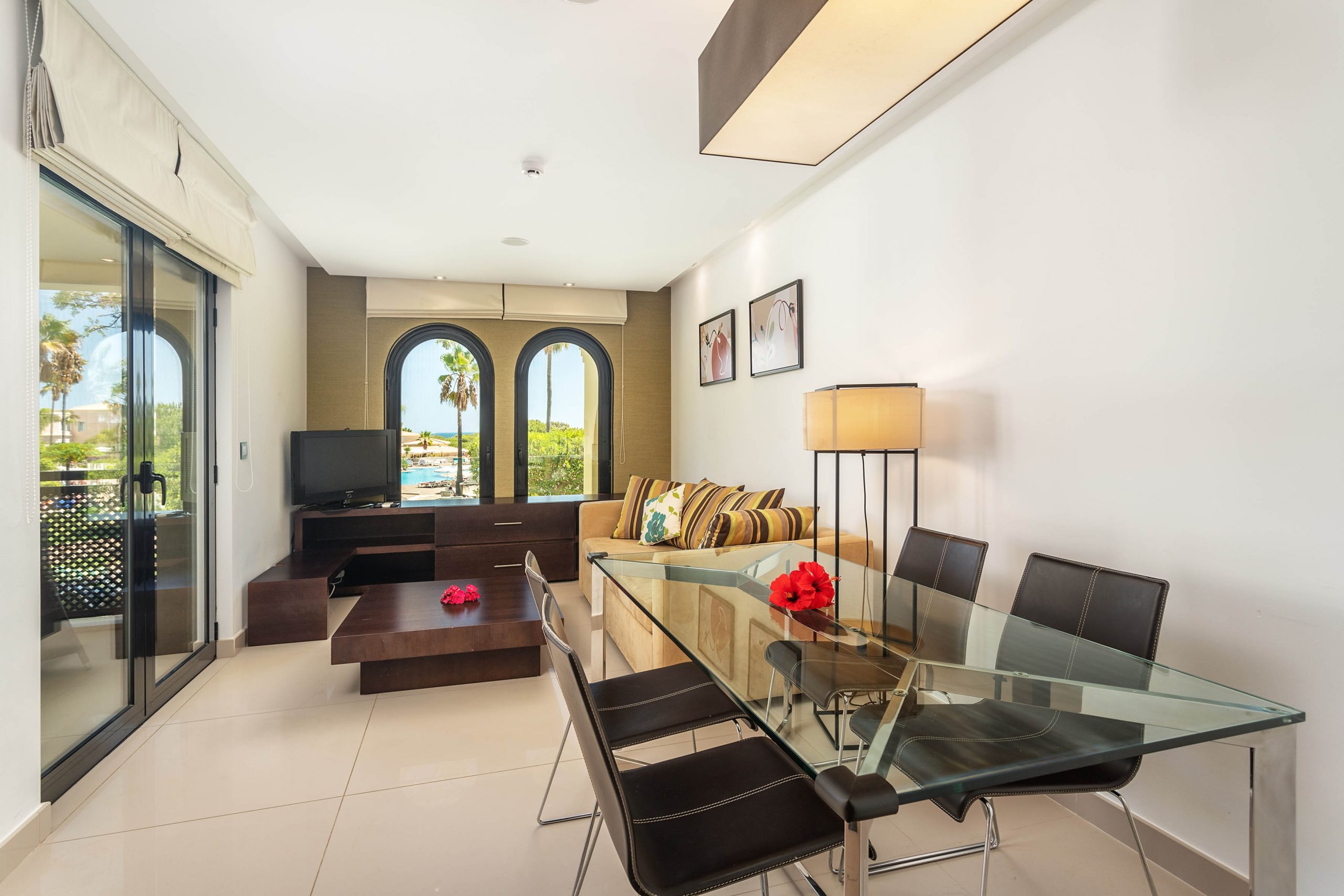 O Apartamento T1 é a opção com mais espaço, ideal para quem ama férias em família. Com capacidade para até 4 adultos e 2 crianças, tem 57 m2 e está localizado perto dos serviços principais do hotel, da animação, das piscinas e do acesso à praia. No apartamento terá ao seu dispor Cozinha equipada com forno, placa, micro-ondas, frigorífico, máquina de lavar loiça e chaleira; Sala com mesa de refeições; Sofá-cama com possibilidade de acomodar 2 crianças até aos 11 anos; Sala equipada com televisão lcd; Quarto equipado com televisão lcd; ar-condicionado; mini frigorífico; telefone; Wi-Fi; 2 casas de banho; Produtos de higiene pessoal gratuitos e Varanda ou terraço.